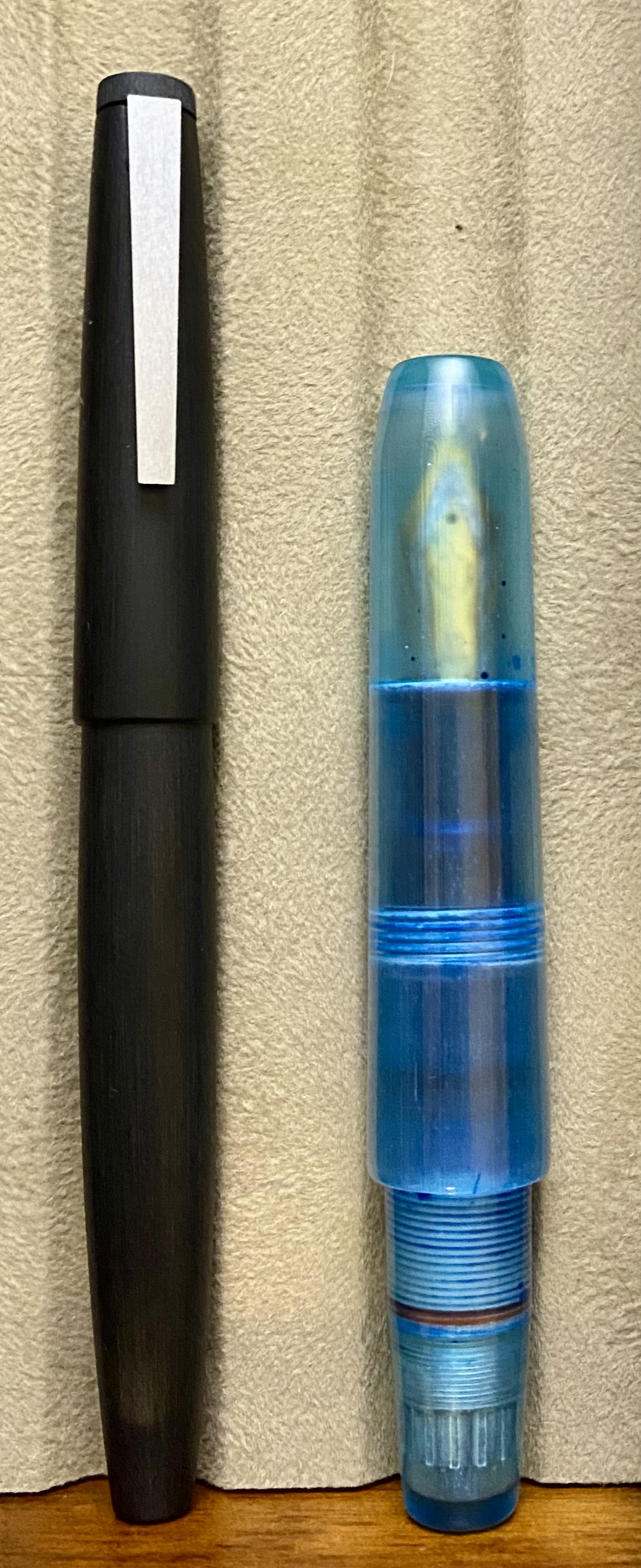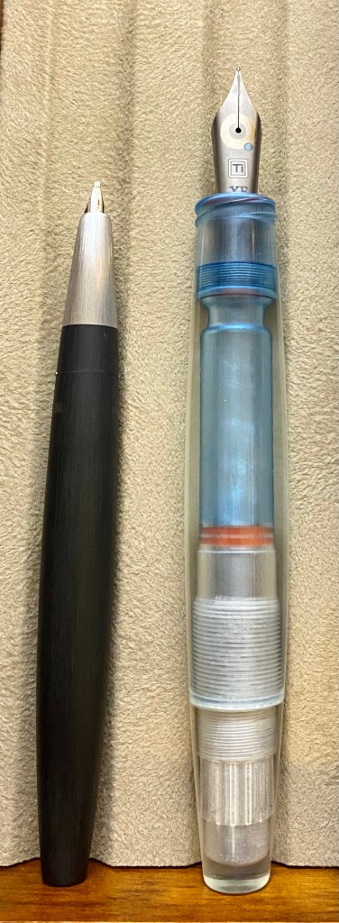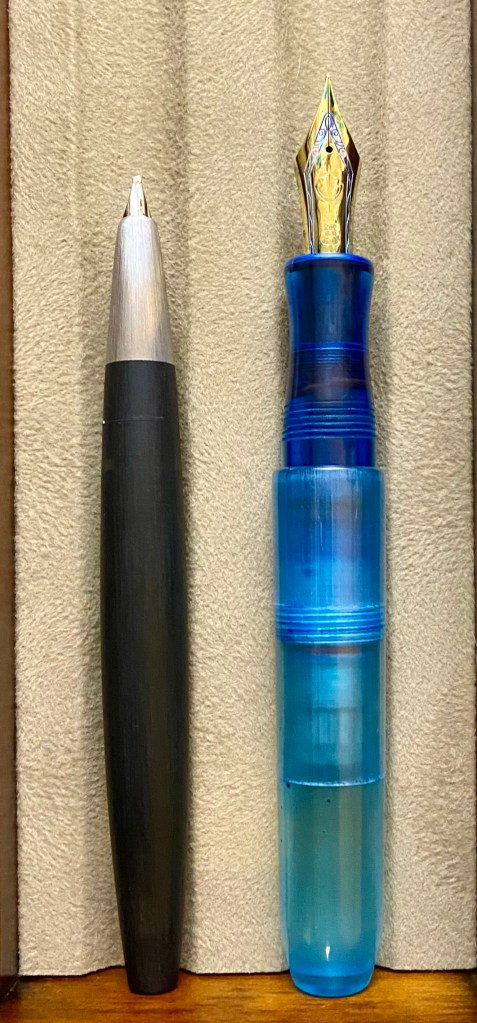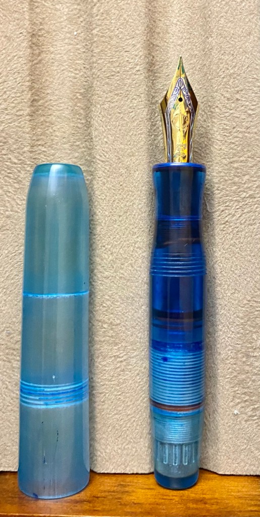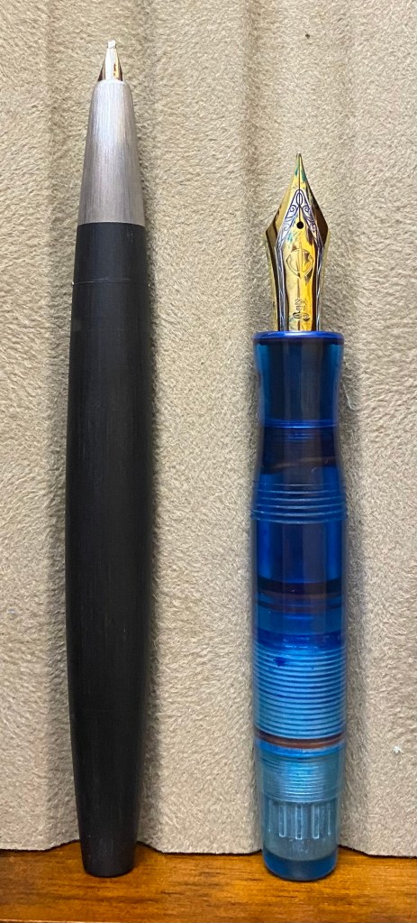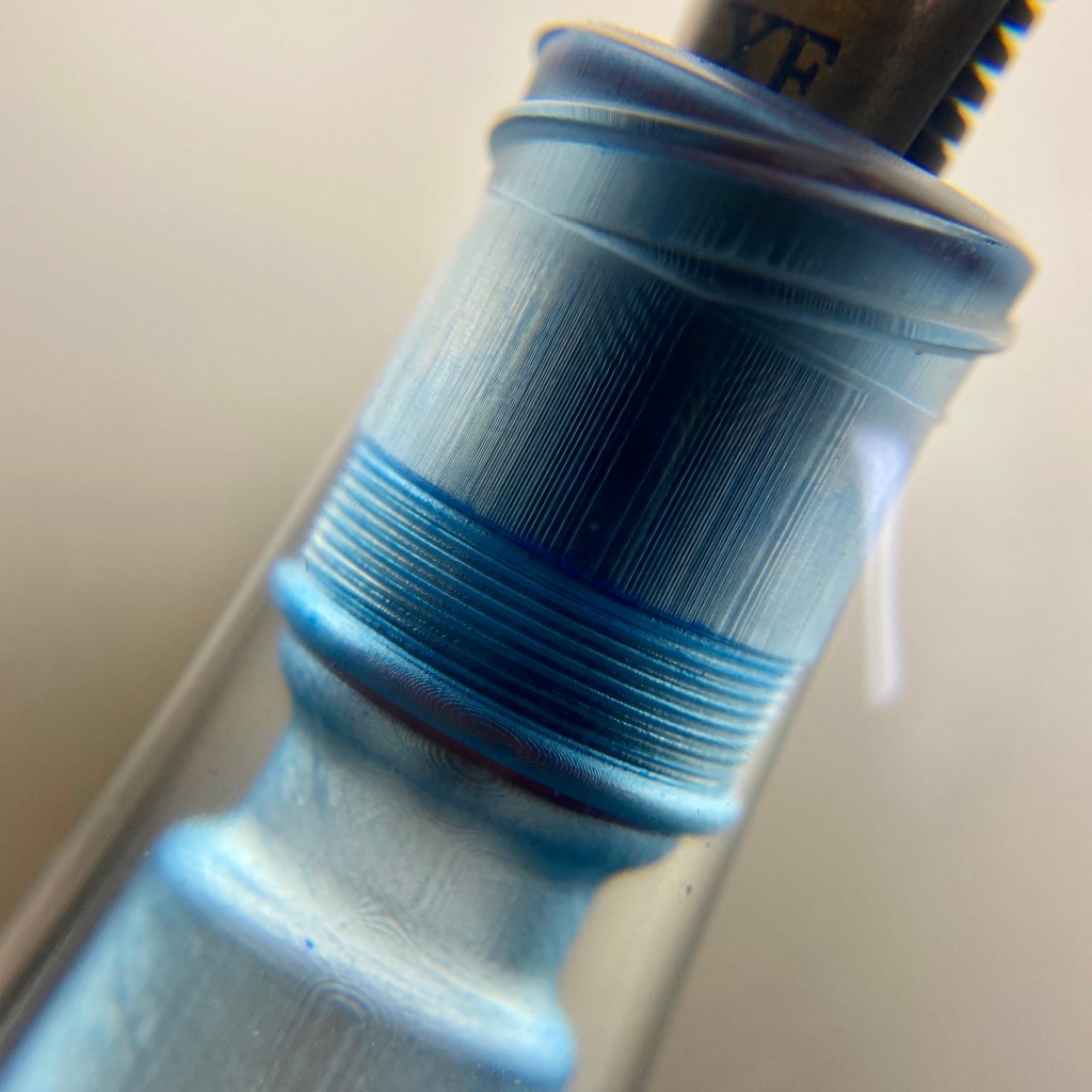 The Pocket Titan, however, is a pen fit for all hand sizes. I ordered this pen in blue, which is achieved by dyeing of the UV-cured printed resin. It uses the “long cap” method employed in so many modern pocket pens, most notably the Kaweco Sport–if the cap is long and extends almost fully over the body when capped, it can be posted on the back of the pen in order to extend the length. Indeed, the cap is just slightly longer than the body of the pen (minus the nib), and can be removed in 2.5 turns. Similar the the torpedo, the body of the pen (besides the blind cap) is a single piece that tapers down past the smooth threads to a pinched section, which is extremely comfortable. This is the type of pen that people describe as “becoming part of the hand” because of how comfortable it is. The piston filling mechanism works flawlessly as well. This pen is sporting a modern Sailor KOP nib, which writes like a dream, so it’s a total success story.