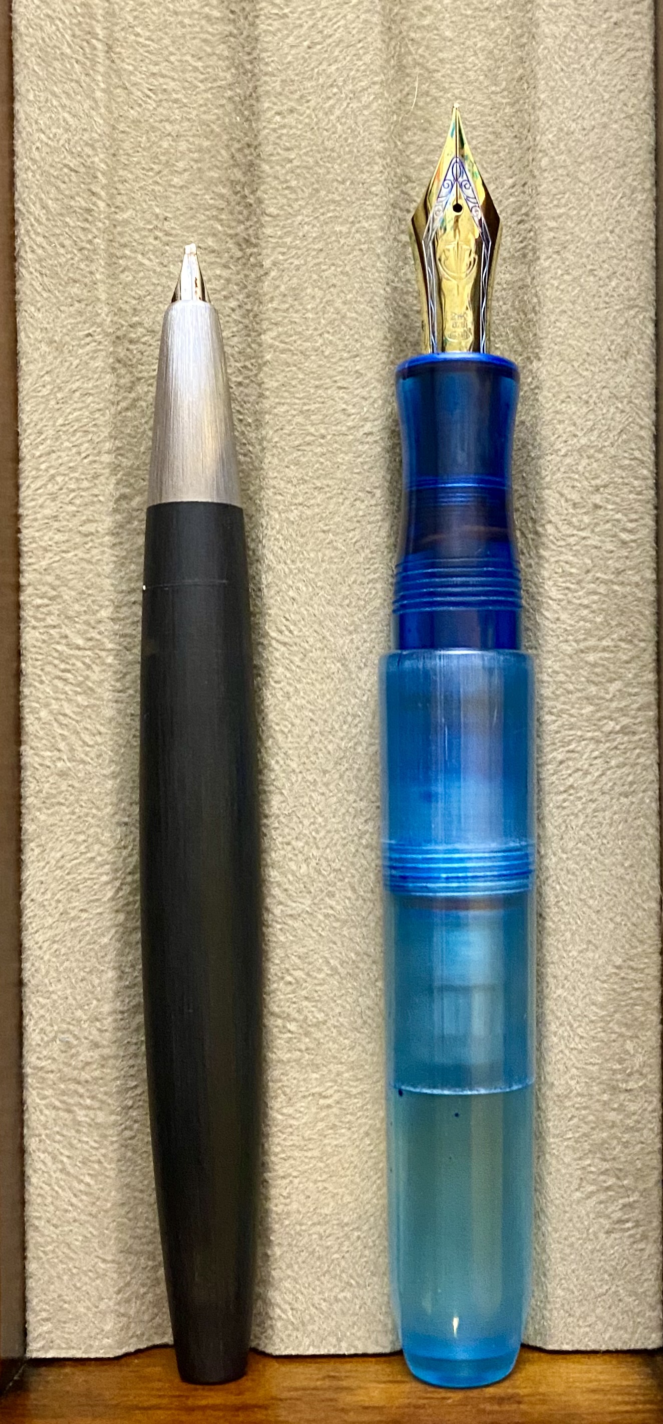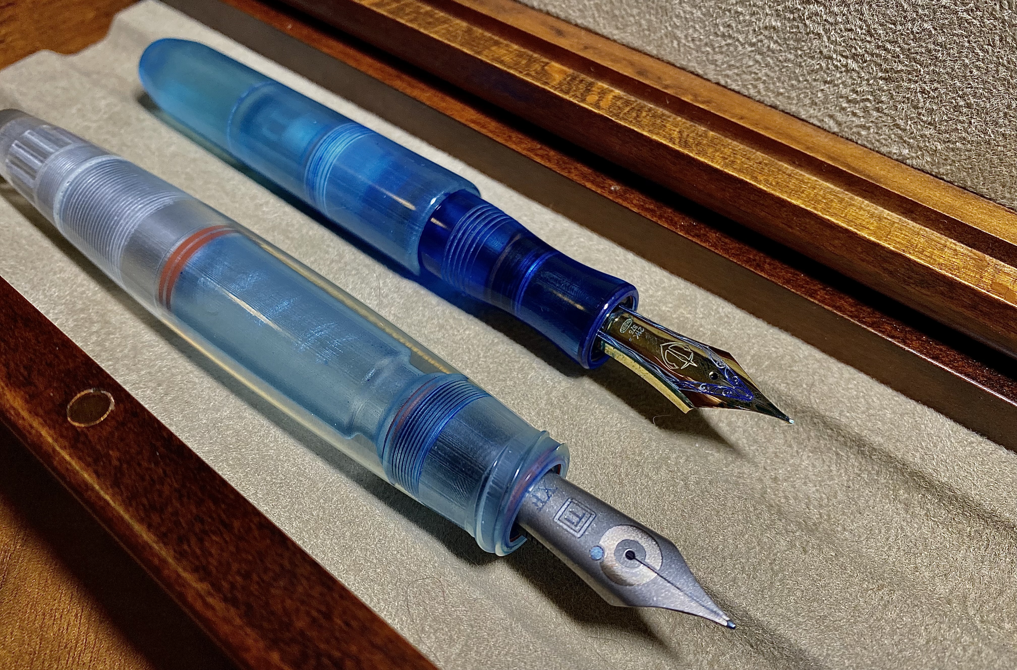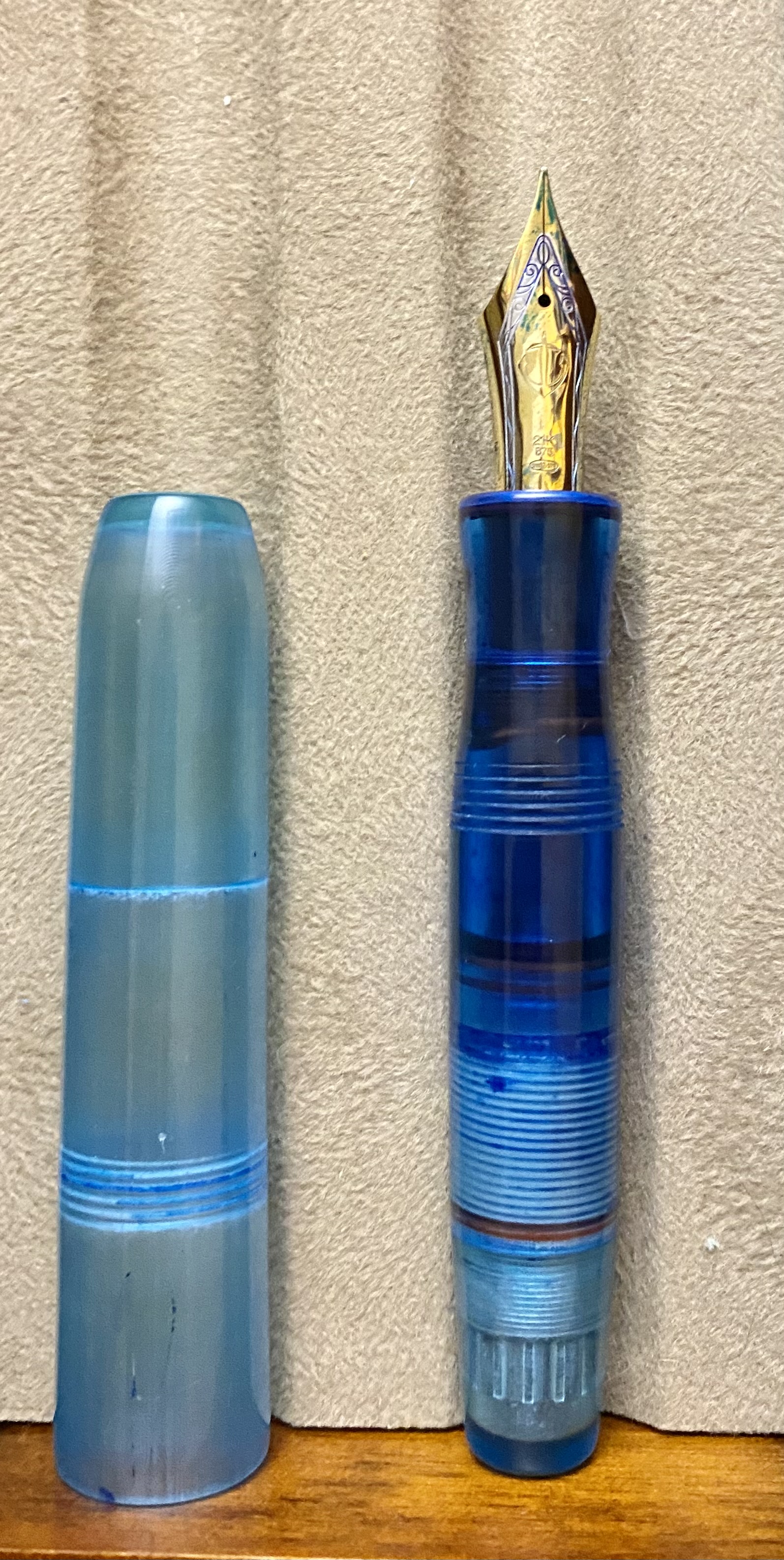 The Pocket Titan, however, is a pen fit for all hand sizes. I ordered this pen in blue, which is achieved by dyeing of the UV-cured printed resin. It uses the “long cap” method employed in so many modern pocket pens, most notably the Kaweco Sport–if the cap is long and extends almost fully over the body when capped, it can be posted on the back of the pen in order to extend the length. Indeed, the cap is just slightly longer than the body of the pen (minus the nib), and can be removed in 2.5 turns. Similar the the torpedo, the body of the pen (besides the blind cap) is a single piece that tapers down past the smooth threads to a pinched section, which is extremely comfortable. This is the type of pen that people describe as “becoming part of the hand” because of how comfortable it is. The piston filling mechanism works flawlessly as well. This pen is sporting a modern Sailor KOP nib, which writes like a dream, so it’s a total success story.