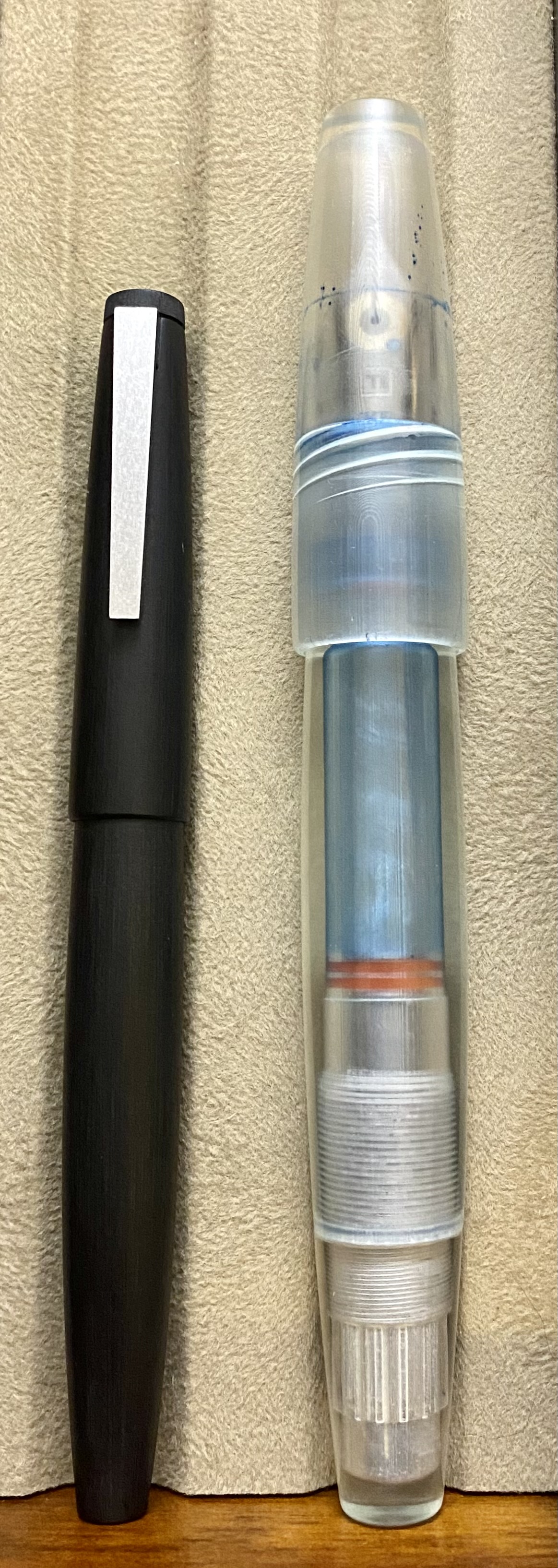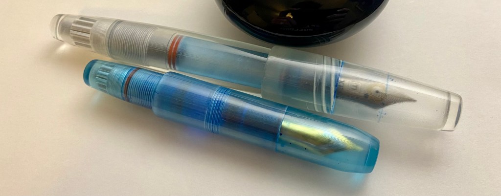 What are the drawbacks of these pens? There aren’t many. Here are the ones that I noticed: first, if you unscrew the blindcap too much, the entire piston unit begins to screw out of the pen. This prevents fully screwing the piston back in, because once the unit is undone, the piston unit is what screws in and out, not the blindcap–>piston rod. William sent me a few videos regarding reassembly, and I was able (with only a little frustration) to put the pen back together after several minutes. This problem was mostly user error, however. Another potential drawback I have encountered so far is staining–Iroshizuku Kon-Peki did a number on the inside of the clear Torpedo, and this resin seems to stain a bit more easily than other demonstrator plastics I have used. I only used water to clean the pen, and the staining doesn’t bother me, so I’m not too worried. I think it may even add character to the pen. I also noticed that the blind cap, when fully screwed in, is not totally flush with the Torpedo’s body–this is a minor problem, as the seam doesn’t rest on my hand, but for somebody with massive hands, it might cause a small amount of discomfort. The Pocket does not suffer from the same issue because the cap is posted over the blind cap.