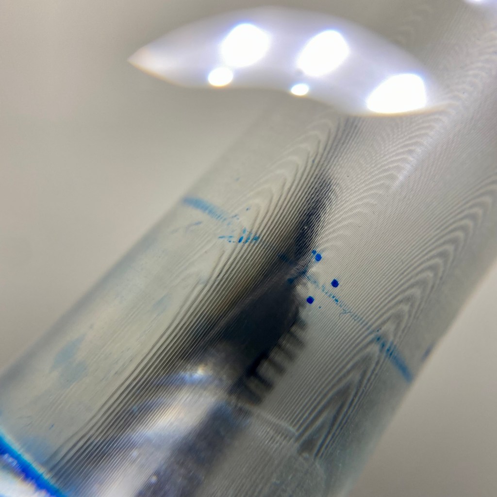 Both pens have visible 3D-printing lines inside the body and (more noticeably) inside the cap. These look nice and add to the novelty of the pen. The ink chambers are also aesthetically pleasing due to the single-piece bodies and, particularly in the Torpedo, the thick resin walls surrounding them. This design creates a sense that the ink is encased deep within the pen, and there aren’t hardware or threads to obstruct the view. Just smooth, clear resin. Both pens are quite light due the lack of any material besides printed resin and o-rings (and the nib unit).